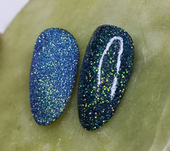 2nd coat of colour, DO NOT cure, put a paper underneath(easy for putting glitter back in pot), pour glitter onto nails, tap off the extra glitter, cure